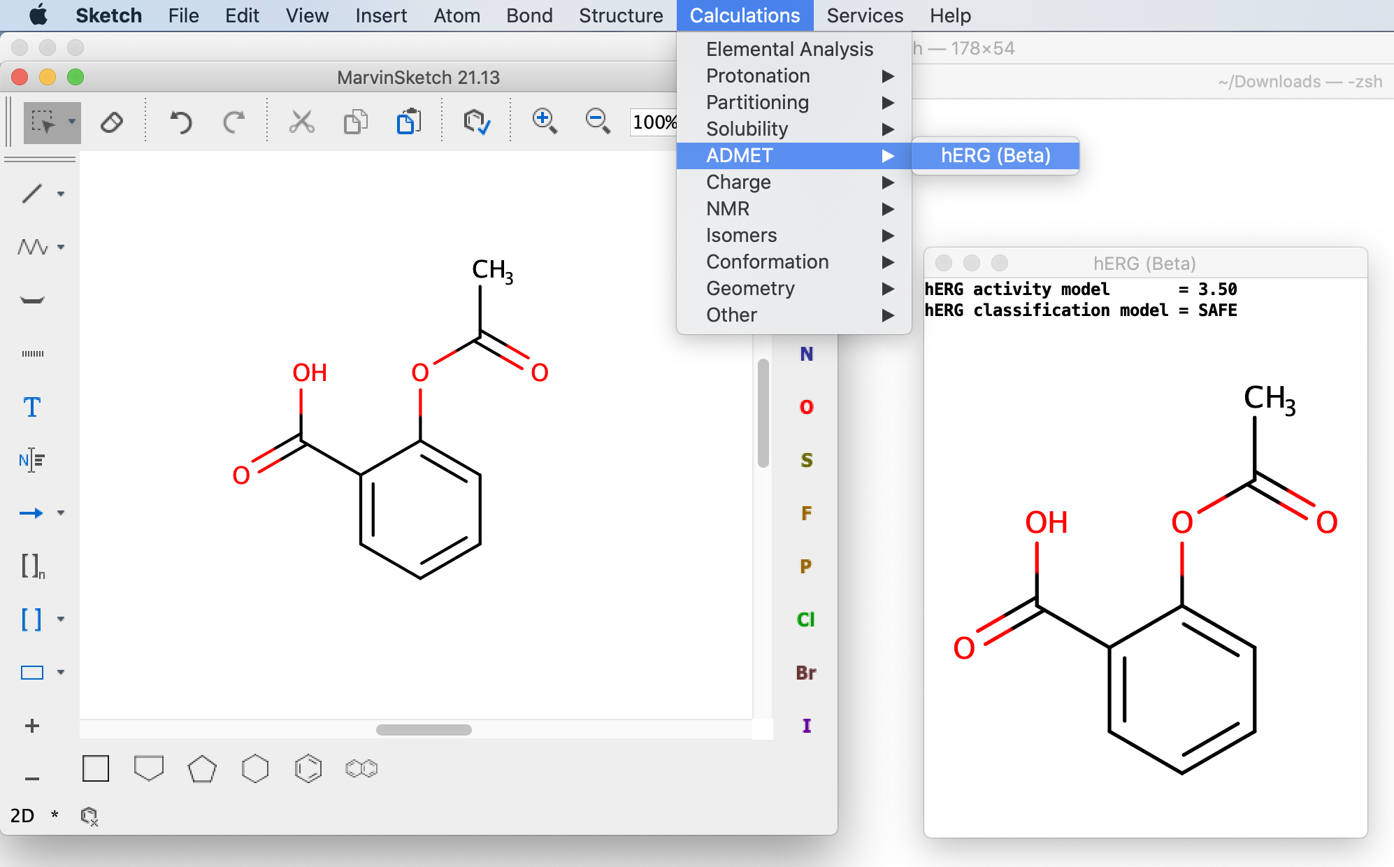 In MarvinSketch hERG prediction can be done with the hERG (Beta) Plugin, which can be found under the Calculations » ADMET menu item. The current version of the plugin returns both the hERG activity and the classification class by default.