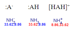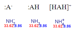 Fig. 4 Calculated pKa of deprotonated, neutral, and the protonated forms of ammonia according to the dynamic red & blue colouring schema