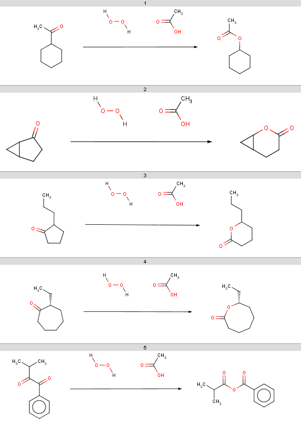 Our second example is the Baeyer-Villiger ketone oxidation **, ** a ketone oxidation to an ester upon treatment with peroxy acids.
