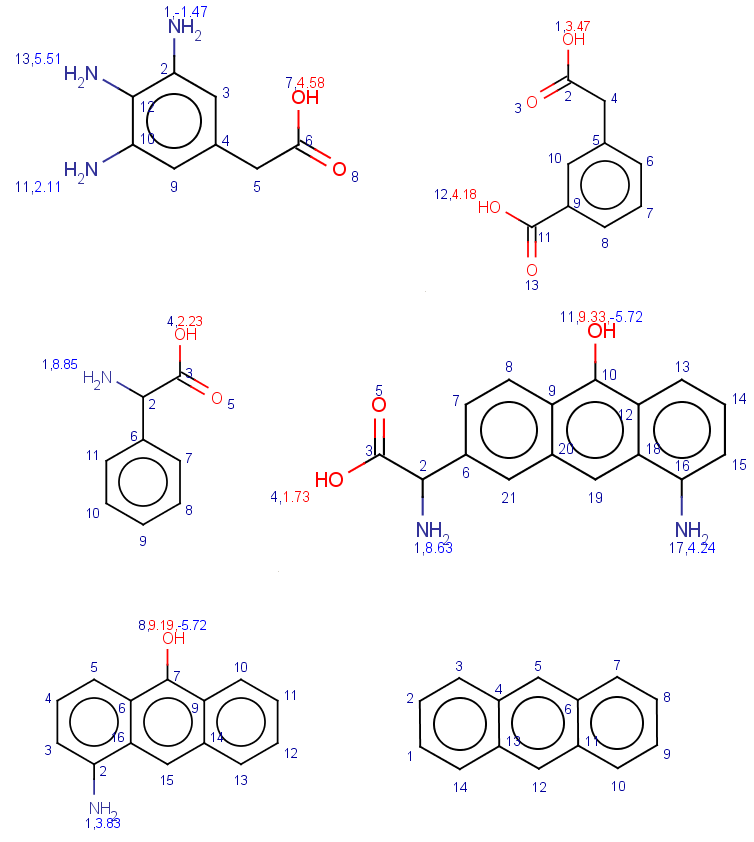 In these examples we filter search hits by setting conditions on pK a values calculated on target atoms matching carboxylic oxygens or nitrogens. In order to check the results easily we show the pK a values together with atom indices for the target molecules: