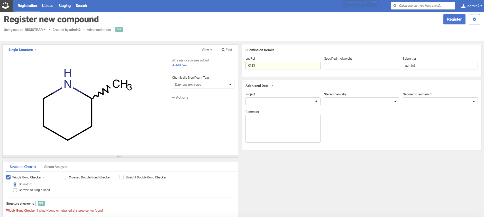 Advanced registration is the process of calling the registration service to register a compound involving besides the globally predefined and configurable set of business rules (validation, standardization, structure checking), the source-based Structure checkers, Stereo Analyzer, Registration options and the match (for multicomponent compounds) or the suggestion (for single/no structures) list.
