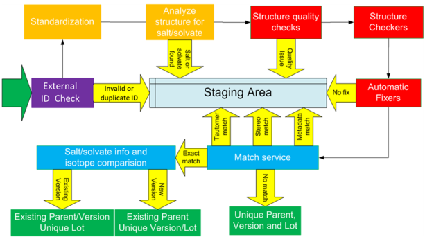 The general registration process is as follows. The data needed for chemical registration process (structure, external IDs, salt/solvate info, etc.) are submitted to the Compound Registration. Everything goes through a comprehensive checking process shown in figure Overview 1, which i ncludes validation, standardization, structure checking (and appropriate auto fixing) and structure matching steps.