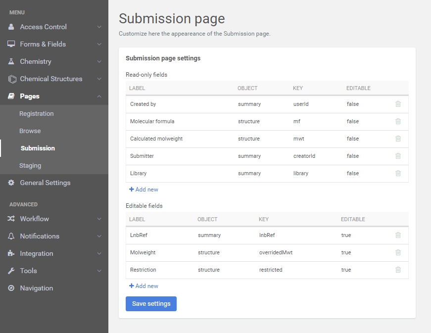 Submission page configurations