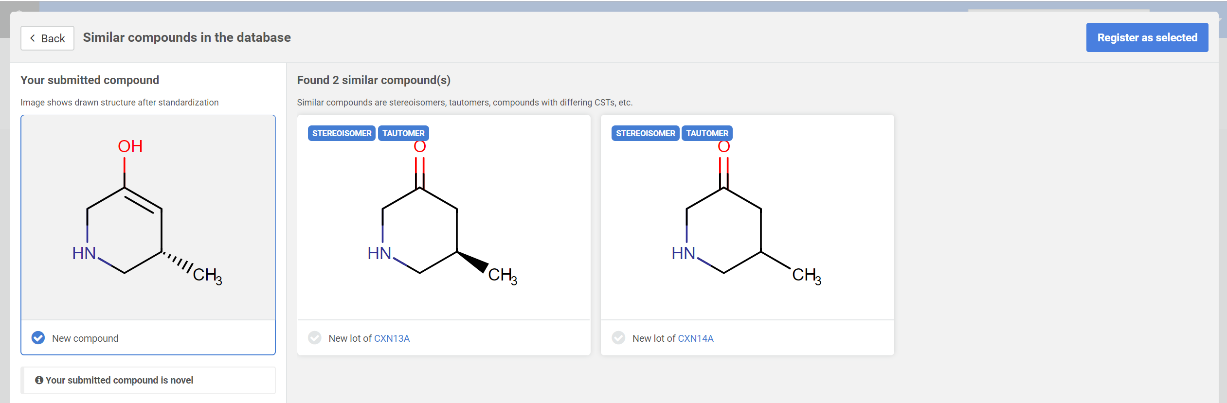 When amending a compound, e.g. CXN14: 5-methylpiperidin-3-one on parent level to (5S)-5-methyl-1,2,5,6-tetrahydropyridin-3-ol, having CXN13: (5R)-5-methylpiperidin-3-one as a stereoisomer & tautomer match, the Suggestion list (Figure D3) will display the matching CXN13A version and also its own parent version (CXN14A).