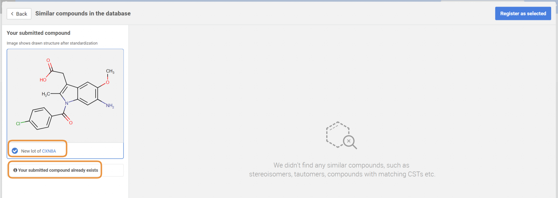 Independently from which level of the tree was the amendment initiated (parent, version or lot level), if there is an exact parent match and non-exact (e.g. stereoisomer, tautomer) matches are not found, an empty Suggestion list will appear (Figure D2). The modified structure will be a new lot (or new version) of an existing parent after clicking the [Register as selected] button.