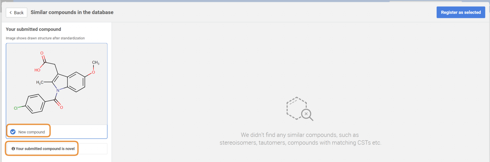 In the case when the amendment was initiated from a parent structure and there are no parent matches to the modified structure an empty Suggestion list will appear where the new structure is displayed as a "New compound" (Figure D1). By clicking the [Register as selected] button, the structural change will be saved and the Ids will be kept.