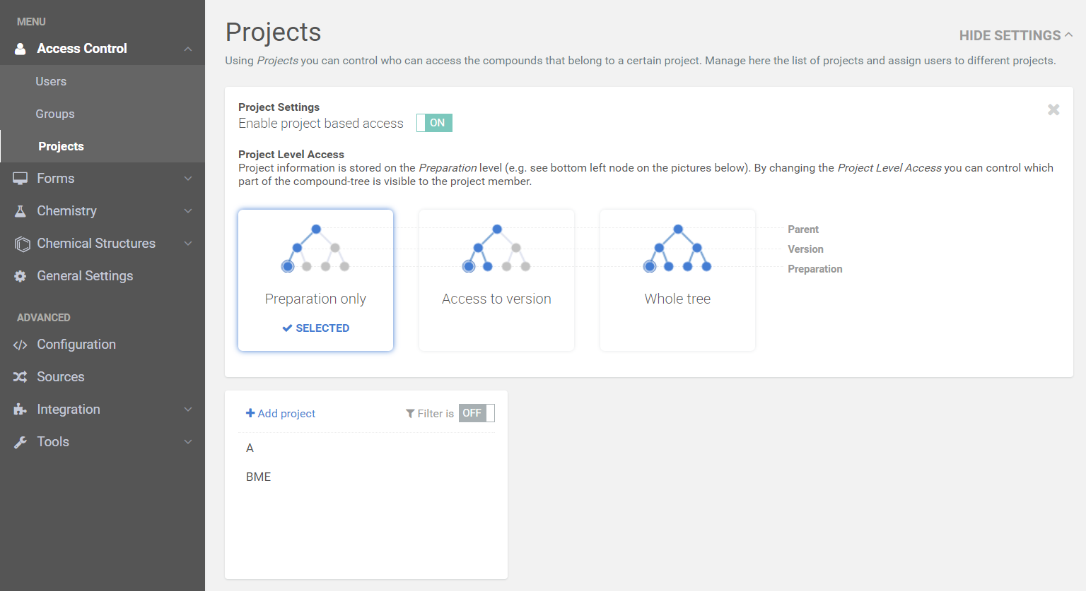 In the Administration/Access control/Projects menu Settings tab the Project based access can be enabled. Once enabled, the access of the registered compounds can be controlled based on the project info and the relation between user and project.