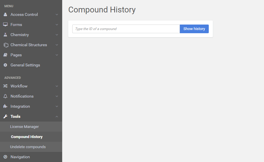 The history of a compound can be accessed by setting the compound ID (PCN, CNor LN). You need to specify the compound ID, then click the [Show history] button.