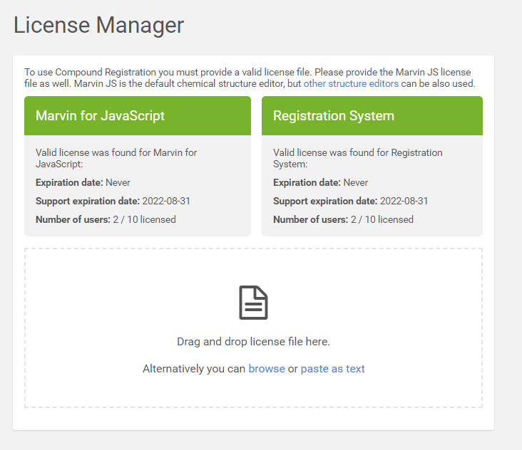 Since Compound Registration version 21.14.0 the License Manager displays both the License Expiration date and the Support Expiration date. Latter is relevant for Perpetual licenses. The License Manager window is also extended with the number of active and licensed Compound Registration users.