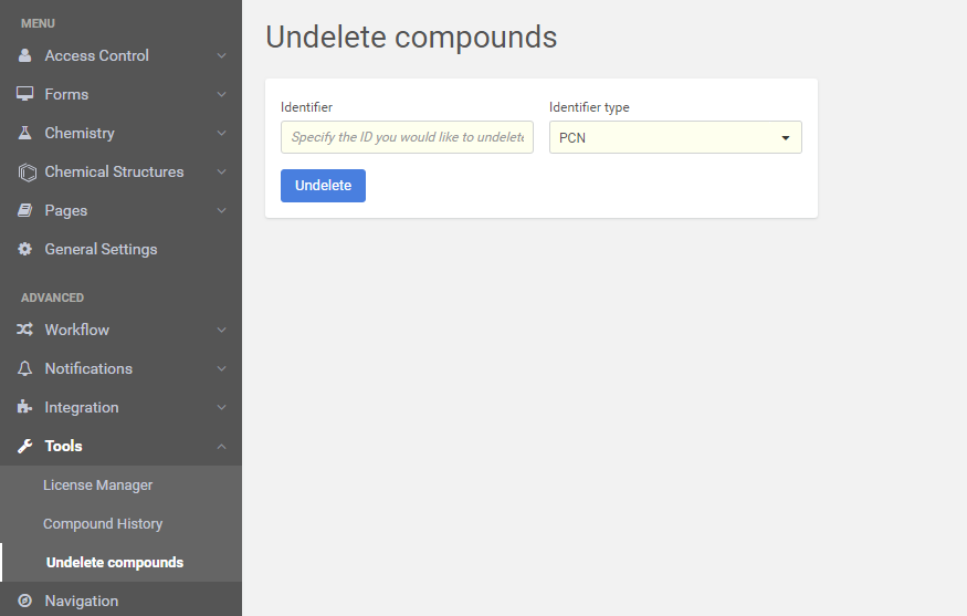 It is possible to restore, "undelete" compounds which were deleted from the DB. You need to specify the ID and the ID type, then click the [Undelete] button.