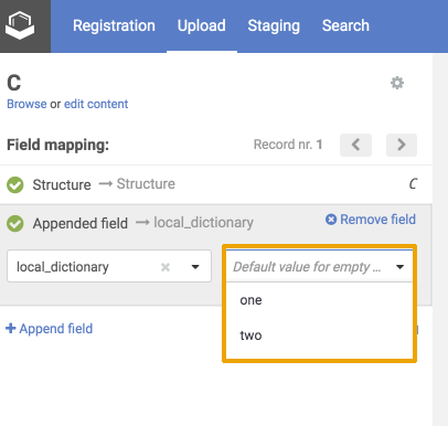When uploading compounds, the data accompanying the structures can be e.g. LnbRef, Lot ID, PCN, CN, CST, Submitter, Salt ID, Salt multiplicity, etc. While the external ID fields (according to the actual business rules, e.g. LnbRef, Lot ID) can be configured to be mandatory or not for the registration, the structure (that can be an empty structure) is usually necessary to be able to initiate a registration (exception "No structures" in case of CSV files). Each column/field of the SD file can be mapped to any of the mandatory and optional fields of the structure object. The mapping can be set manually by selecting the appropriate parameter from the drop-down list above each column. E.g. "user" from the SD file can be mapped with "Lot submitter" from the DB table. The mapping can be saved in a text file using the [Save mapping] button and can be used again for other bulk upload registrations using the [Load mapping] button. When a field exists but contains a value just for some structures, there is a possibility to set a default value for the empty cases. After mapping the fields and setting a default value for the empty cases, the existing values will not be lost, just a value for the empty ones will be set.