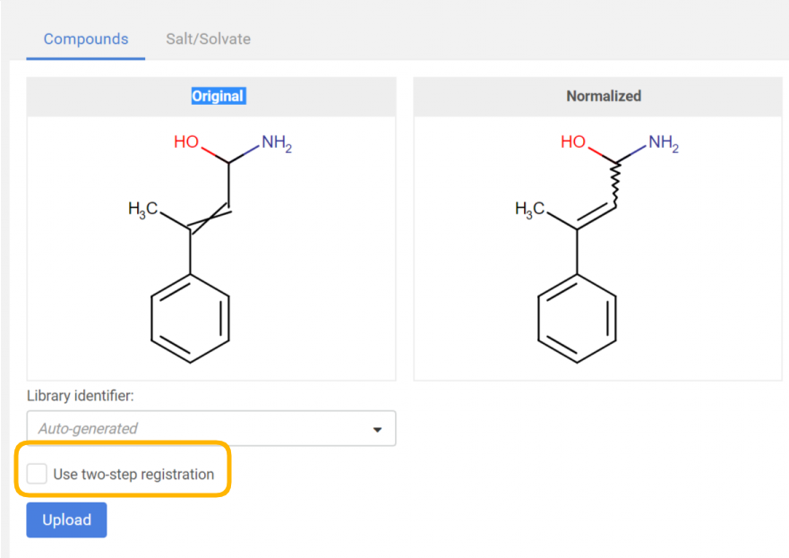 The two-step registration option allows the user to pre-register the compounds to the staging area in order to check them before registration.