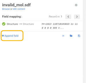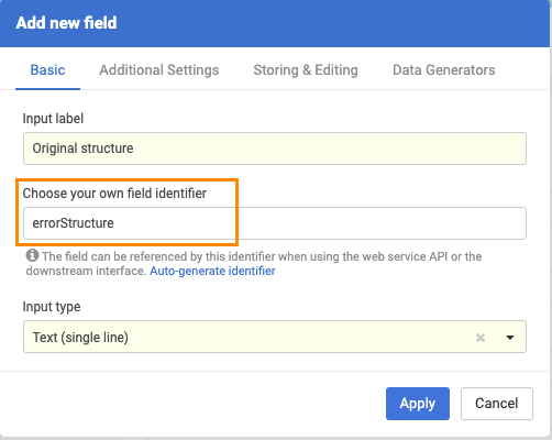 In order to prepare the system for storing the original (invalid) molfile as a text, an additional data field should be created (Administration/Forms and Fields) that has the "errorStructure" as field identifier.