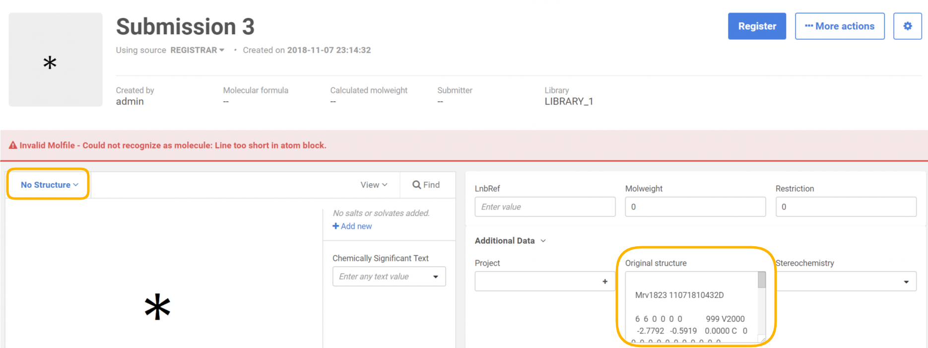 In the case of SDF files the structure field is mandatory. When the "structure" part is "empty" a No structure registration is triggered.