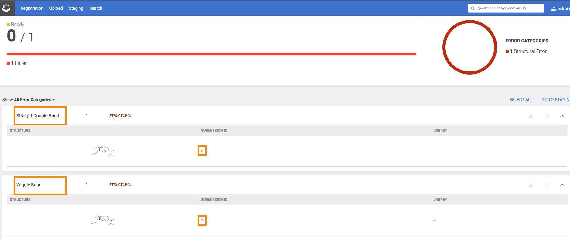 The failing submission section contains status, structure, submission Id, Project, SaltSolvateComposition, MF.