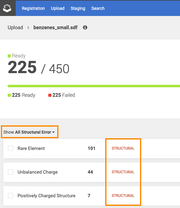 The upload report in PDF contains all items from the uploaded SDF with all the relevant info. The registered structures appear in the first section of the PDF, the failed ones are after.
