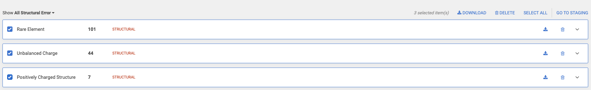 All submissions or just the selected one by error type can be downloaded in SDF format.