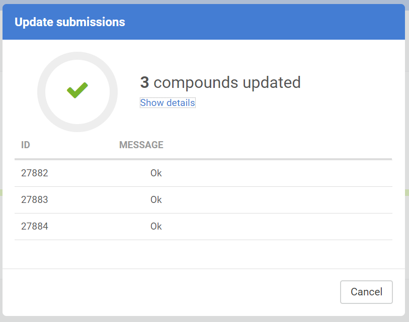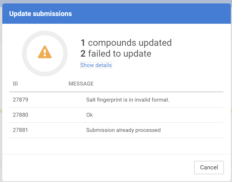The user can easily download one or all the problematic structures and fixed them locally and then re-upload them with the update option, and register the whole uploaded set without errors. The update process performed based on matching submission IDs, in case of non-matching submission ID, the update attempt will be ignored. When the update is finished the number of successful and ignored structure updates appear.