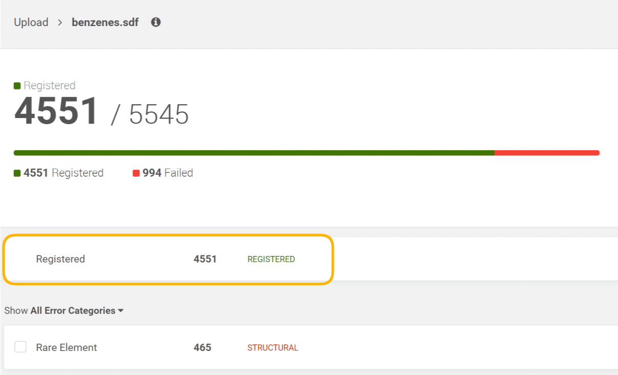 In case when a regular bulk upload process is made the successfully registered compounds appear in the Registered category.