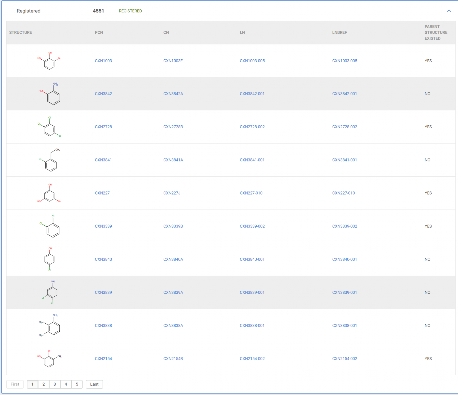 The list of successfully registered compounds is paginated and contains all relevant Ids (PCN, LN, LnbRef, and CN-configurable) and the info whether the compound was a newly registered one or not.
