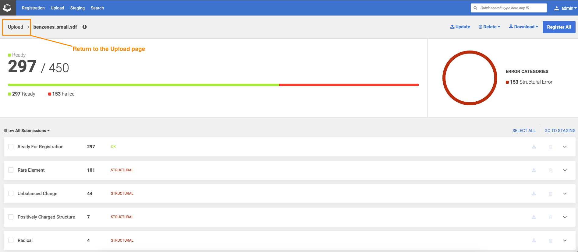 With the help of this function you can delete all submissions from staging and all registered structures that were created during this bulk upload. Registered structures can be only deleted if they were not modified since the upload.
