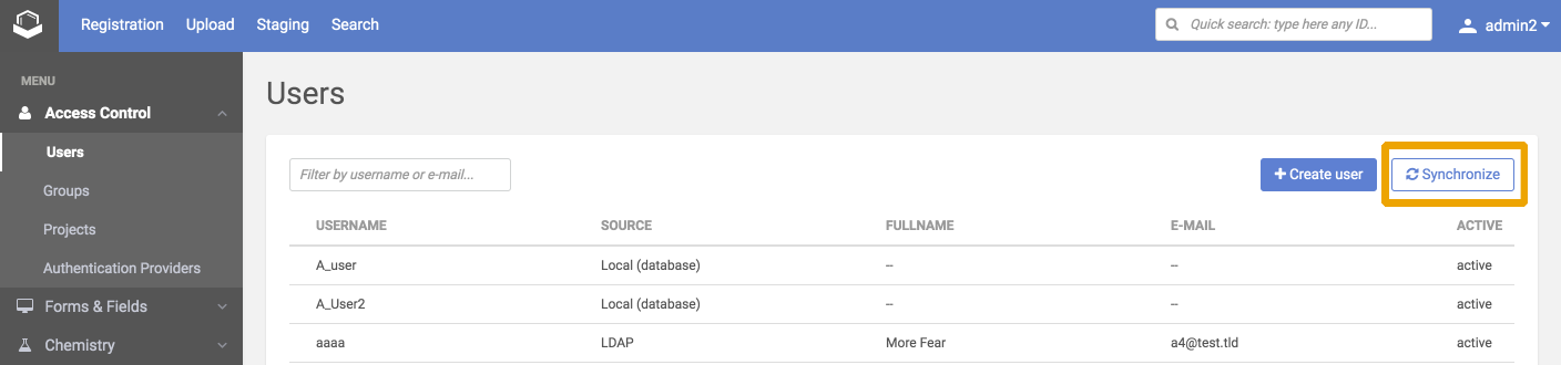 If you log in with a new remote user or you click on the Synchronize button, these remote users will be listed on the Users page and their details will be synchronized with Compound Registration.