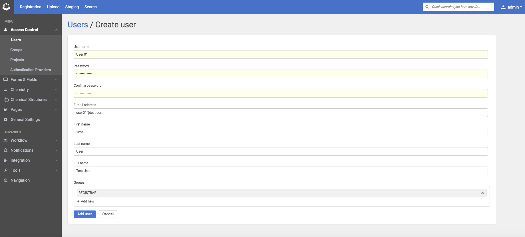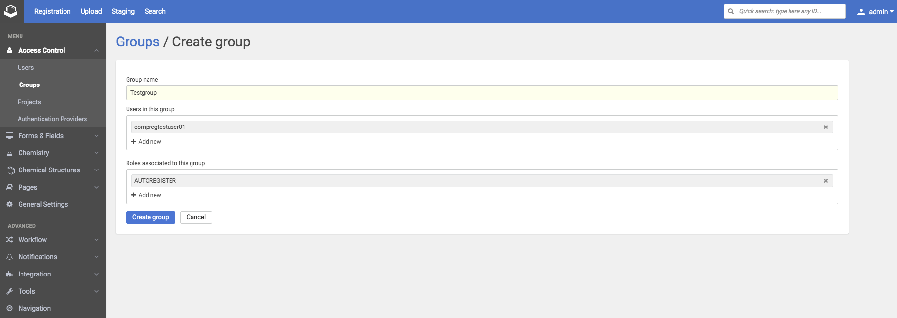 For example, for a user to be able to register a compound, it needs to have the AUTOREGISTER or the ADVANCED_AUTOREGISTER role. Predefined groups associated with this role are the USER and the REGISTRAR groups. For more information on roles visit this page.