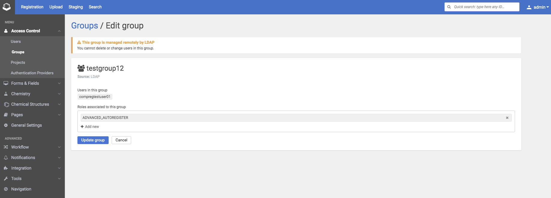 the group must exist in both the LDAP/AD and Compound Registration