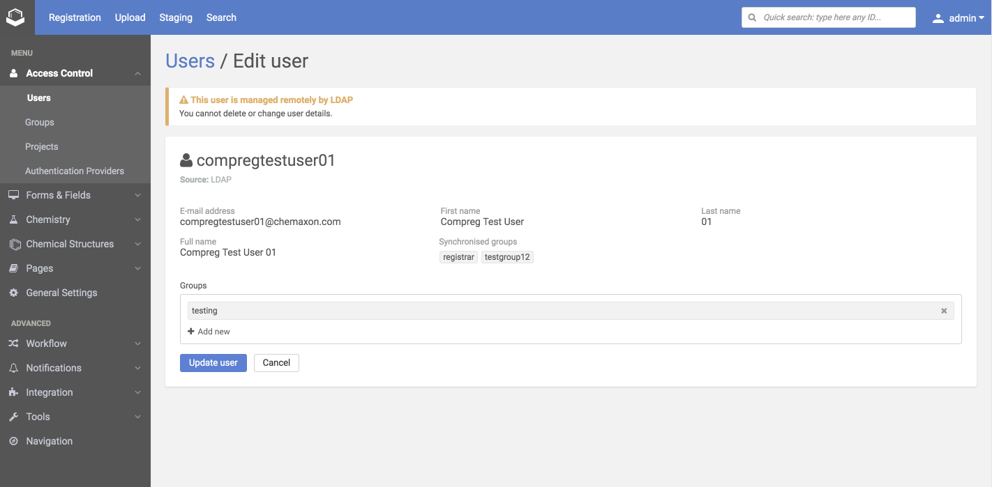 In case of remote users (AD/LDAP/SAML) the e-mail address, first name, last name, full name, and remote groups will be synchronized with Compound Registration if it is configured (Authentication), therefore these properties are not editable for a remote user. The only thing that is allowed for remote users is to manage its local groups.