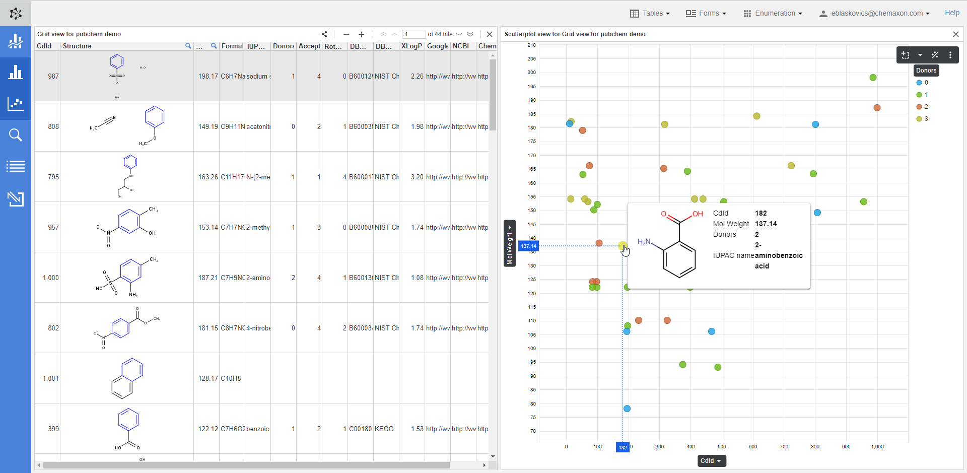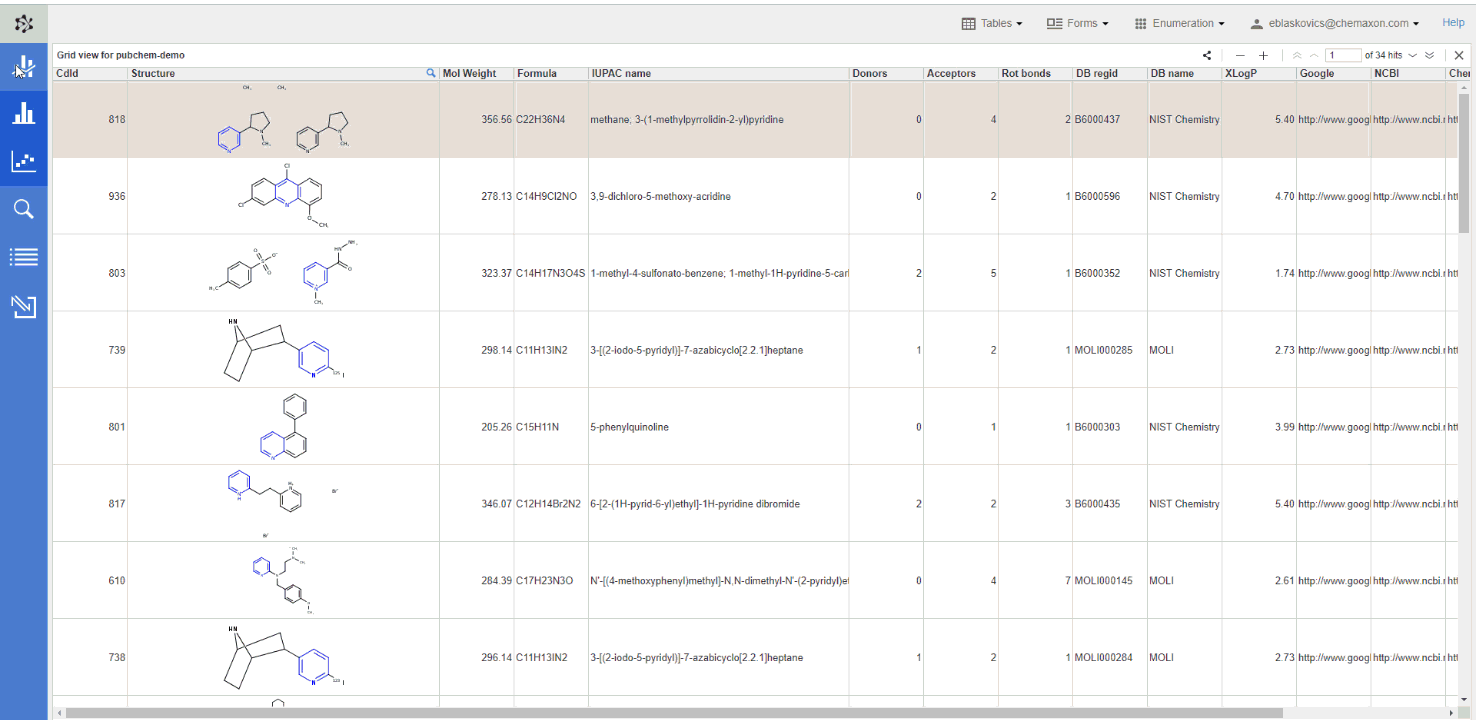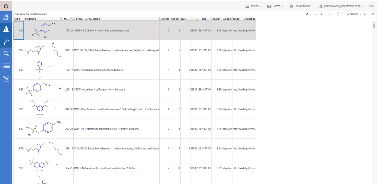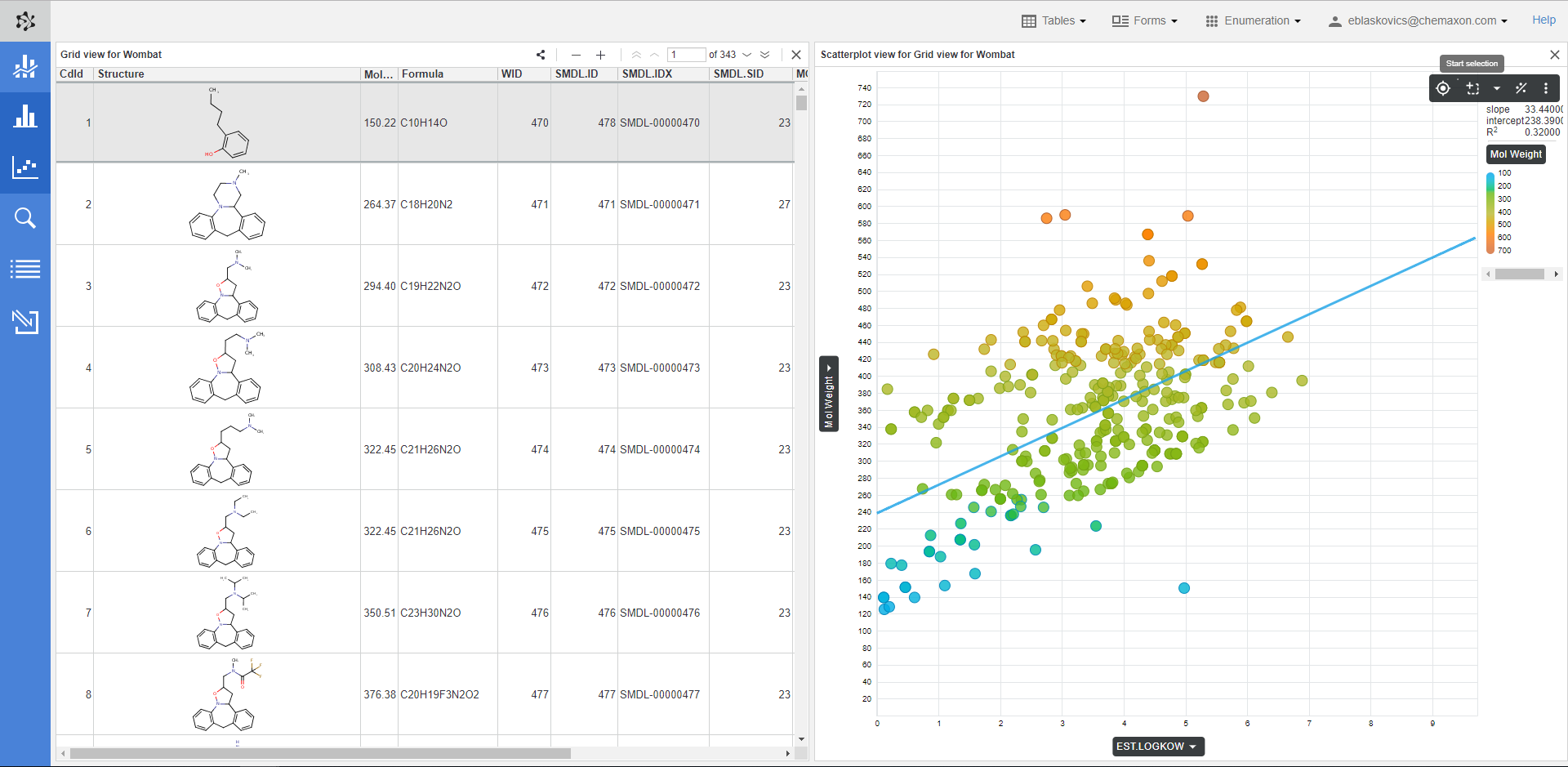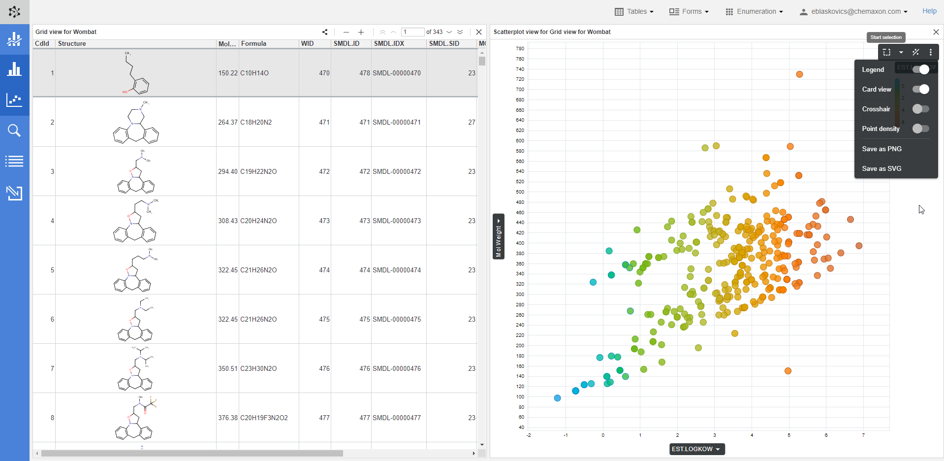 The Charts view component enables the user to display chemical structures on the axes in the chart. Displaying R-groups is also possible. This functionality offers enhanced support of research workflows and improved examination of relationships between your molecules.