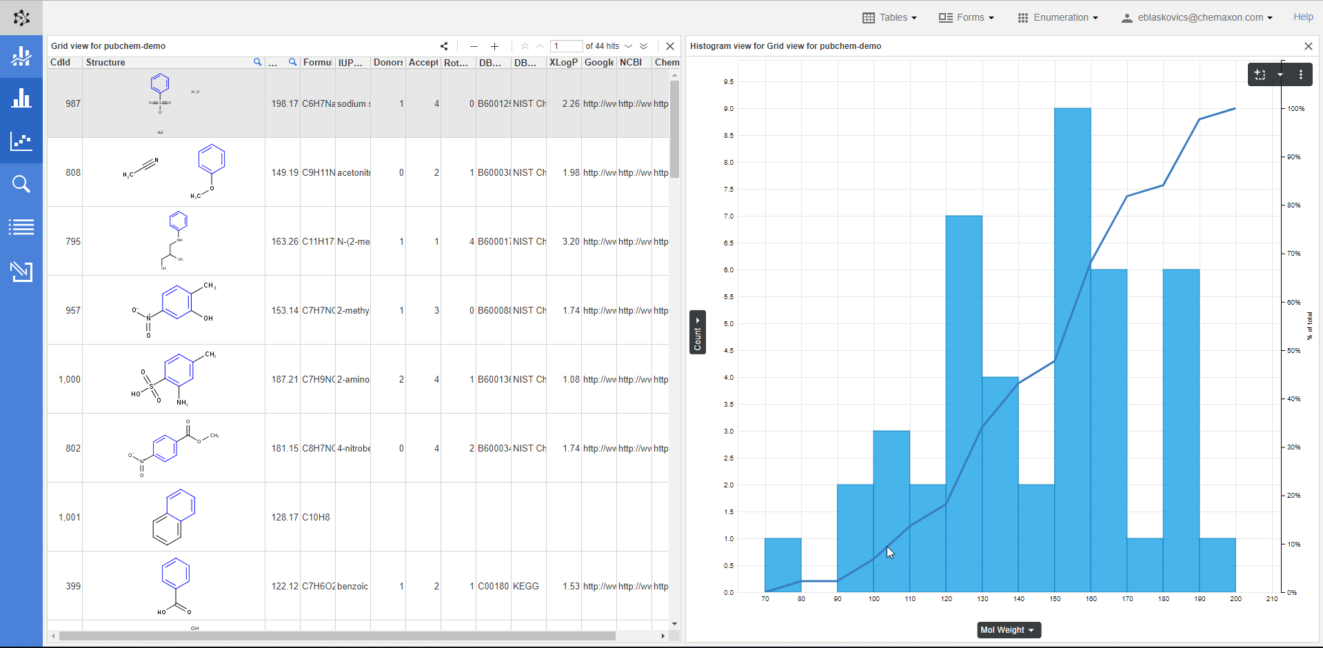 Data displayed in both Connect grid and form view can be visualized using an integrated component called Charts view. For instance, displaying molecular weight distribution within a data set as a histogram.