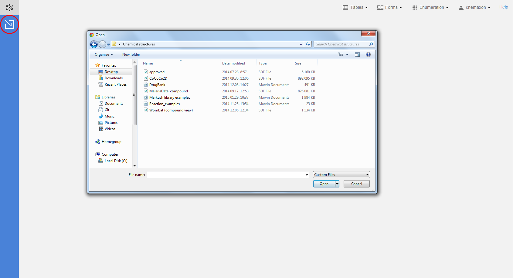 Currently, your data can be imported either in MRV or SDF files. Choose the ** Import** button from the toolbar on the left side of the application; in the launching Open dialog you can look up your file from the file system.