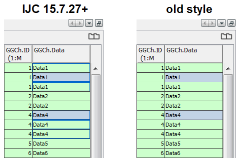 When selecting more than one row, such as Data1 and Data4 in one entity, the selected cells are highlighted in grey. Additionally, all the cells linked to the same row(s) as the currently selected cells are highlighted by a blue border, as you can notice below. In addition to the two selected cells, four more cells also containing Data1 and Data4 are highlighted.