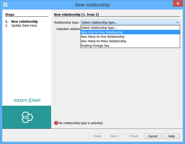 To promote a foreign key to an Relationship select the foreign key and click on the 'Promote to Relationship' button in the toolbar. Alternatively use the third option described above for creating a relationship. A wizard will open and prompt you for any necessary information.