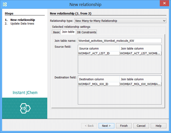 Promoting foreign keys to a many-to-many relationship is more complex as two foreign keys are involved as well as a join table. Start by selecting one of the foreign keys and clicking on the promote button as for the simple relationships. When the wizard opens check the 'Use join table' checkbox and then specify the appropriate join table and second foreign key.