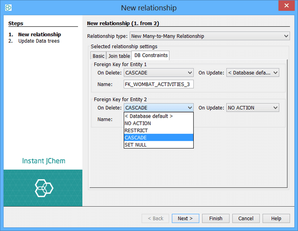 Go to the Constraints tab and make any changes that are needed here. This tab defines the database foreign key constraint. The foreign key constraint will only be added if the 'Create DB constraints' checkbox is checked on the first tab.