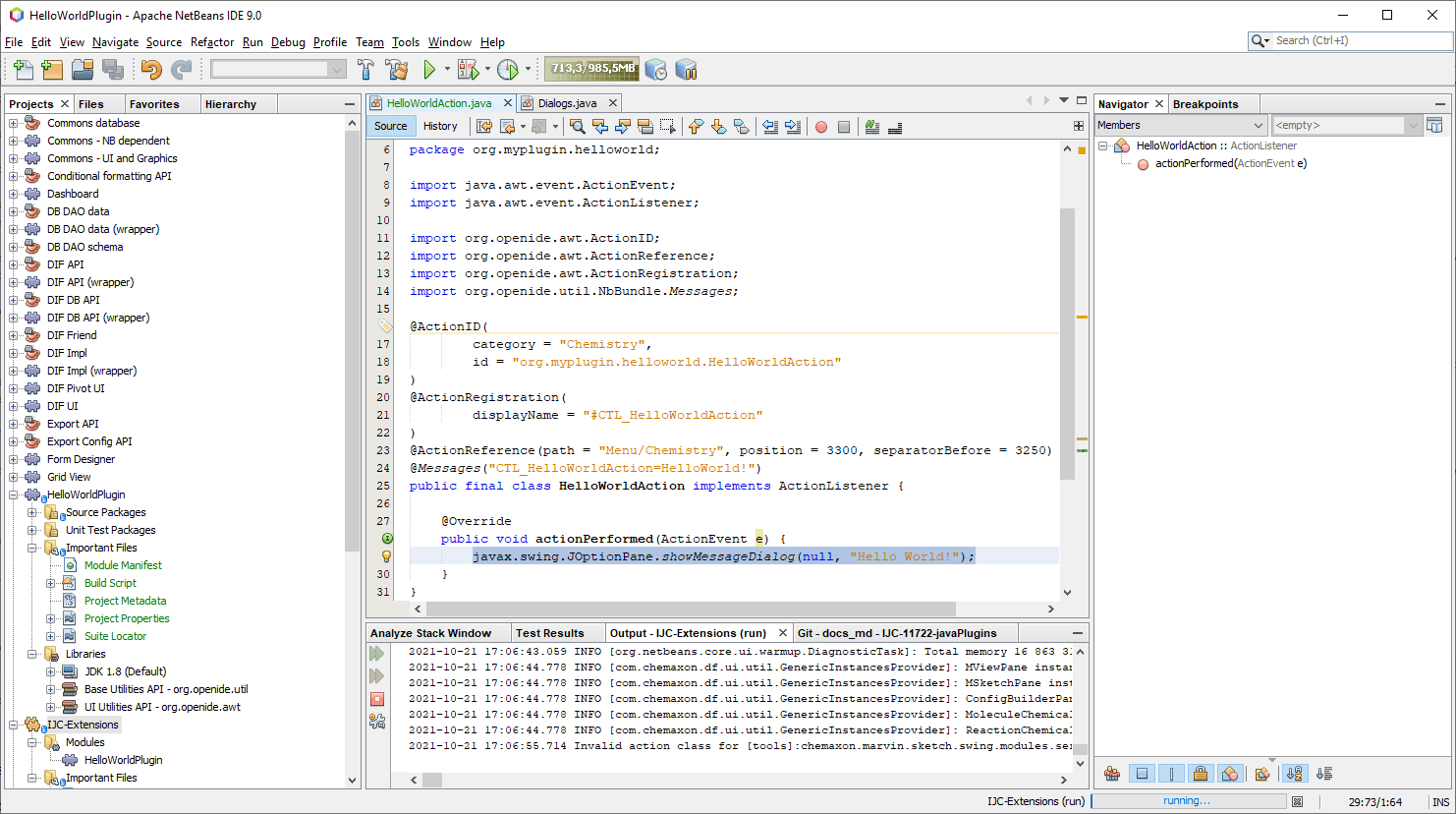 So far we have created a module suite and added new module to it. In order to test the module we will add some very basic functionality to it. We are going to create an action that will print "Hello World!" text and place it in the Instant JChem's main menu called 'Chemistry'.