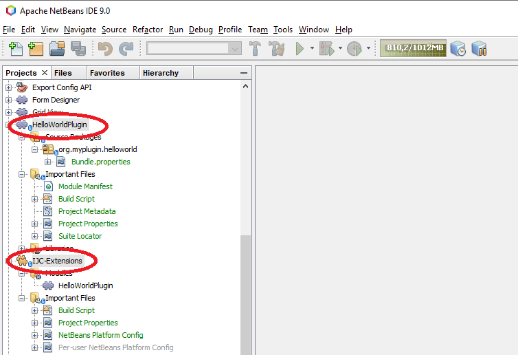 When the wizard creates 'HelloWorldPlugin' project you will see it in the IDE's 'Projects' explorer alongside the 'IJC-Extensions' module suite project. The 'HelloWorldPlugin' project will also appear under the 'IJC-Extensions' module suite's 'Modules' node to indicate that the module is part of the suite.