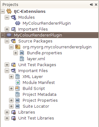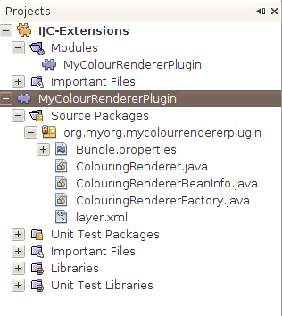 If you've followed this tutorial closely you should now have all files in your 'MyColourRendererPlugin' project ready. The project in NetBeans IDE's 'Projects' explorer should look like the picture below.