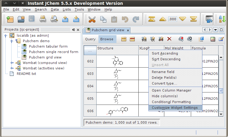 In the 'Projects' explorer open 'localdb' -> 'Pubchem demo' -> 'Pubchem grid view' view.