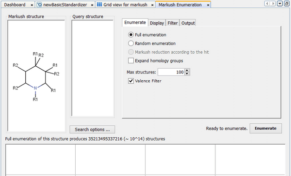 - This performs exhaustive enumeration of the Markush structure. Markush libraries can potentially be vast in size (bigger that the number of atoms in the universe!), so the enumeration is limited to a maximum number of structures that you can specify. By default this is set to 100 structures.