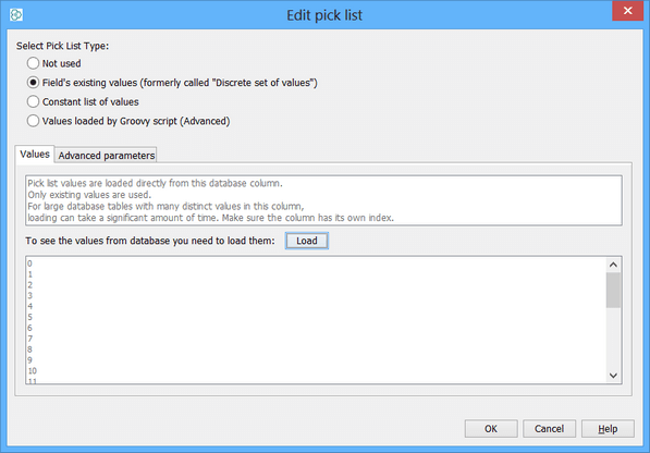 This is the easiest option. Pick list will access all the possible values in the field and make them available for selection. You need to load the available values from the database by clicking the "Load" button.