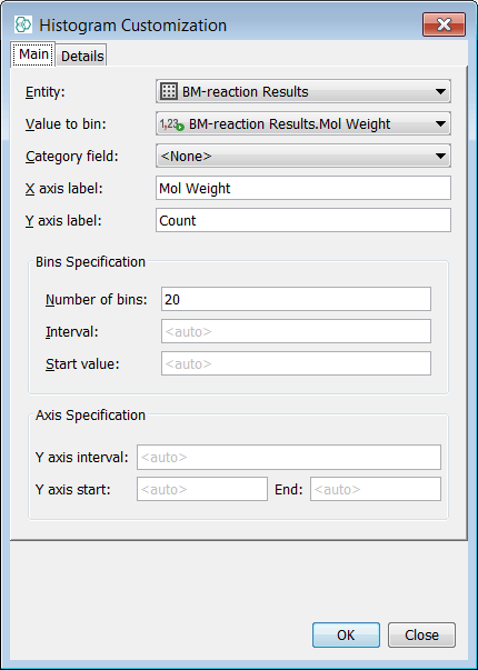 4. Select MolWeight as the Value to Bin and set the number of bins to 20 in the Histogram Customization dialog