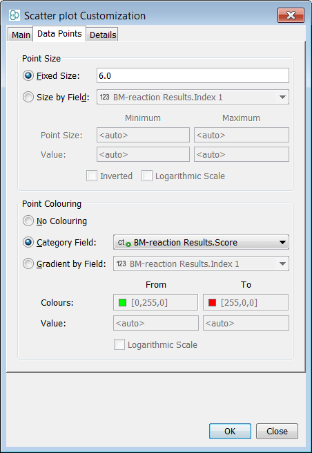 9. Use the Score as Category field in the Data Points tab of Scatter plot Customization window