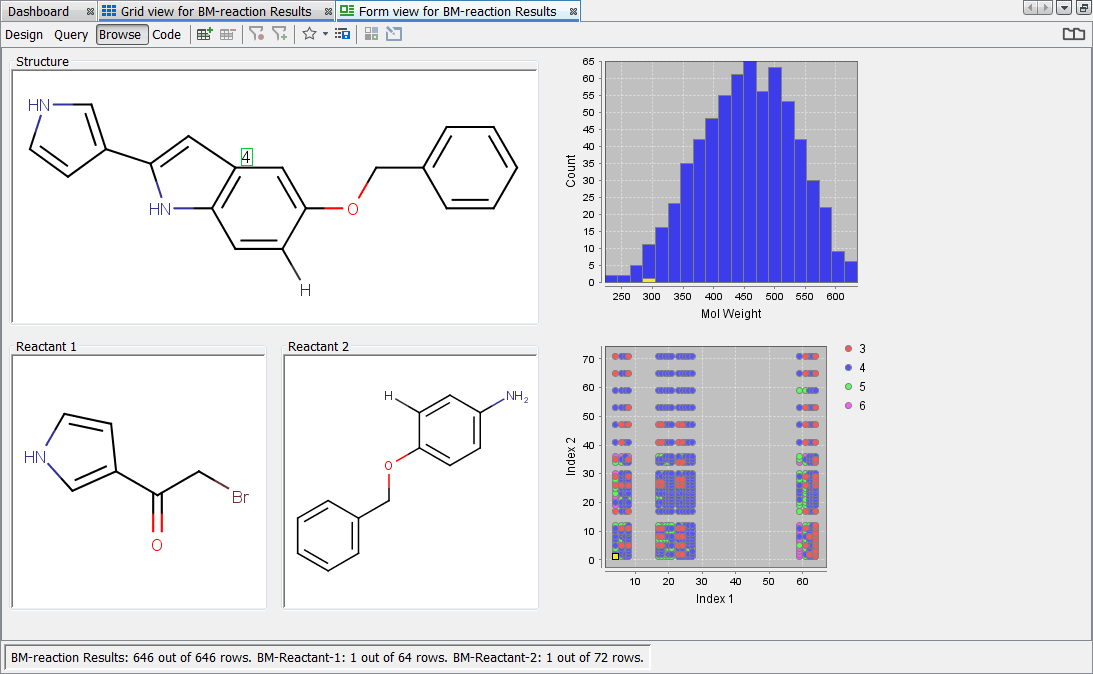 This tutorial will introduce you to the process of reaction enumeration in Instant JChem starting from a set of suitable reactants. It will guide you through the process of setting up a reaction, customizing the enumeration process and the output. It will also give a step by step guidance to the post processing of the results, including property calculations and visualization of the data.