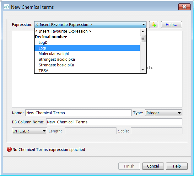 New Chemical Terms Field Window allows to write an expression in Chemical Terms Language. For now we choose logP in the predefined favorites expressions and add them by clicking Finish.