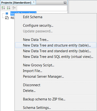 Next we should need to create a data tree with a structures table and there are two approaches to this. You can either right click on the schema node and a menu will appear. Then select New Data tree and structure entoty (table)... . Alternatively, you could complete the same result with operations in the schema editor with the same result. Create a structures entity in the entities tab by right clicking New Structure entity (table)... . Then at the data tree level, promote it using New Data tree from entity ... * Additionally, you can create the entity directly at the data tree level by selecting *New Data Tree and structure entity (table)... Using the preferred method, create a data tree with a root node named "PubChem2Da".