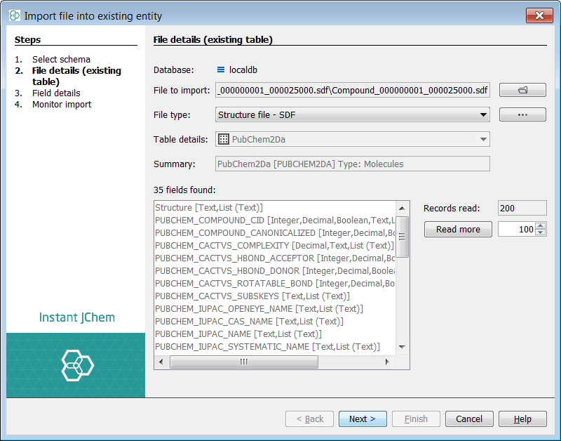 Finally, you can import data into each entity. This is completed at the entity level. In the entities tab, right click on the Structures entity "PubChem2Da" using the Import File Into X... and select the SDF file. Select Next (we will accept all suggested fields) then Next again and the import commences, finally select Finish once completed.