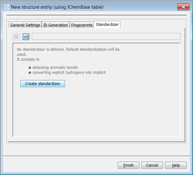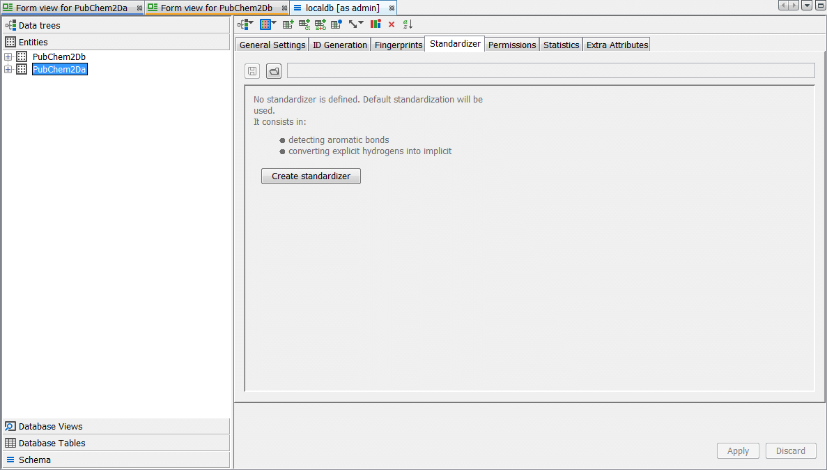 The standardizer rules are applied for the entity on import but can also be re-applied as a later event. Since we have not yet explicitly defined or applied any standardizer rules yet we will be able to see the effects of the default standardization which is automatically applied. This is often referred to as "Aromatize and remove explicit Hydrogens". It is possible to apply a standardizer in create entity dialog as well as from the schema editor for an existing entity. Later we will complete both these routes with the addition of a Nitro functional group rule and examine the same end result.