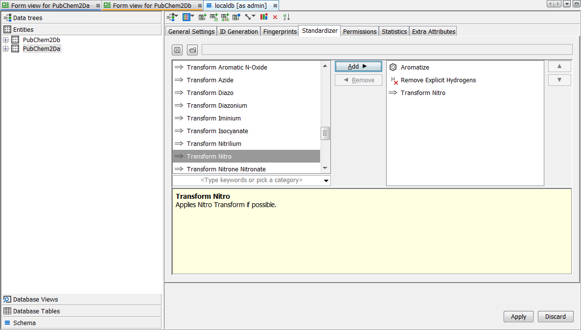 Finally we apply the same standardization to the existing entity "PubChem2Da". Right click on the schema node and select Edit Schema then select the entity level tab. Select the entity "PubChem2Da" and then the Standardizer tab. Currently you will see that only the defaults are applied. Select the Create standardizer button. Now from the list of possible options on the left find "Nitro" and use the Add button to add it to the standardizer for the entity. Use the arrow buttons to place it at the top. Press the Apply button to regenerate the table with a new standardization applied.